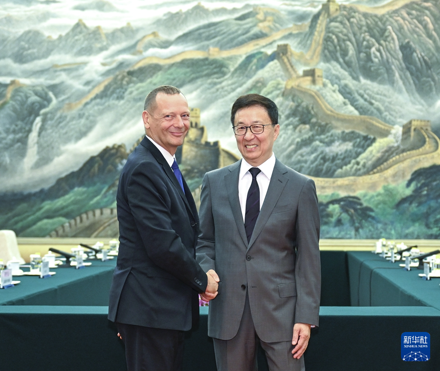 10月16日下午,国家副主席韩正在北京会见法国总统外事顾问博内。新华社记者 张玲 摄